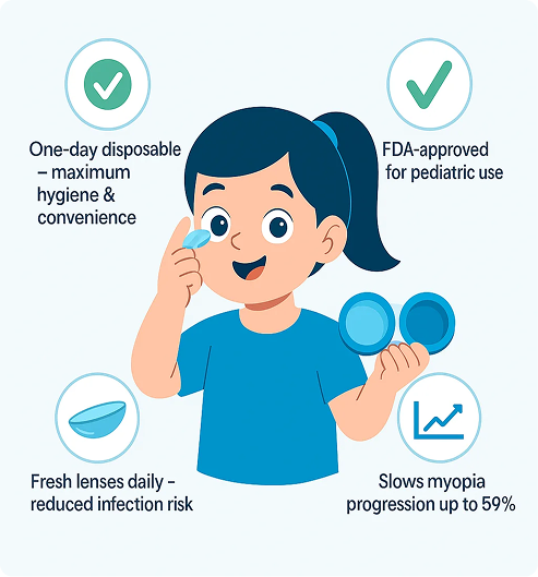One-day disposable contact lenses offer the ultimate in convenience and hygiene, as fresh lenses are used daily, reducing the risk of infection and providing optimal comfort for children.
